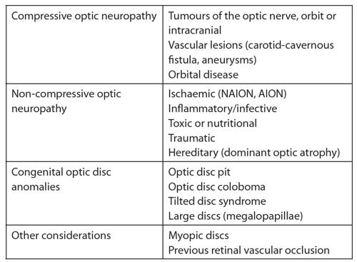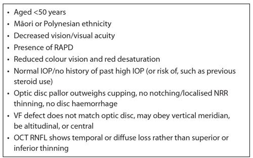 In most cases, it’s possible to distinguish between glaucomatous and non-glaucomatous optic neuropathy with careful history and clinical assessment as there are characteristic differences in clinical presentation. These differences are highlighted in Table 2, and the presence of one or more of these red flags when working-up a glaucoma patient (particularly for normal-tension glaucoma) should heighten your suspicion that an alternative diagnosis to glaucoma may be present. Patients with one or more of these red flags need to be referred for further investigation, specifically neuroimaging.