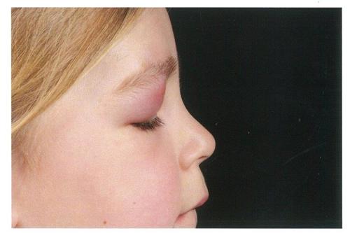 A 6-year-old female was referred by her GP with the chief complaint being right, upper lid swelling. Prior to that, there was a history of sinusitis with coryzal symptoms for a week. She was initially treated by her GP with oral antibiotics for 10 days and there was no improvement at all.