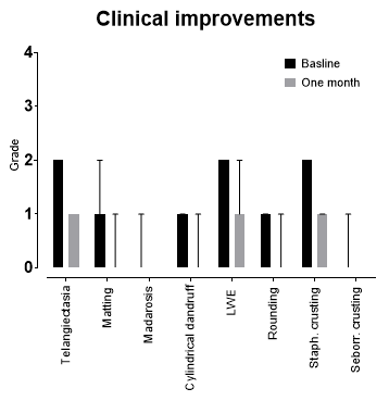 After four weeks of castor oil use, significant improvements in symptoms were reflected in improved OSDI (19.8 ± 13.7 versus 14.0 ± 12.4) and DEQ-5 (9.4 ± 3.1 versus 8.2 ± 3.3) scores (p<0.01). Treated eyes showed significant improvements in telangiectasia, eyelash matting, madarosis, cylindrical dandruff and lid wiper epitheliopathy grades (p<0.01) (Fig 2). Improvements in lid margin rounding, staphylococcal and seborrheic eyelash crusting were noted in both treated and control eyes (p<0.05). No significant changes were observed in tear film parameters, bulbar conjunctival hyperaemia, lid margin notching, foaming, trichiasis, Demodex presence, corneal and conjunctival staining, or meibomian gland characteristics (p>0.05). All returned bottles showed significant weight reduction, reflecting good treatment compliance (p<0.001).