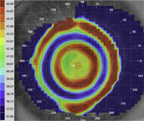 Fig 5. Over-topography of NaturalVue. Note the difficulties the topographer has showing the rapid increase in peripheral plus. Photo courtesy of David Sweeney, supplied by Sally Dillehay, CMO of Visioneering Technologies