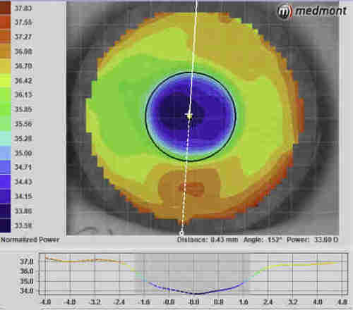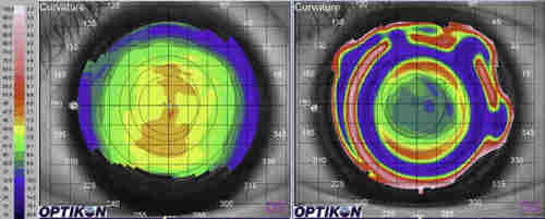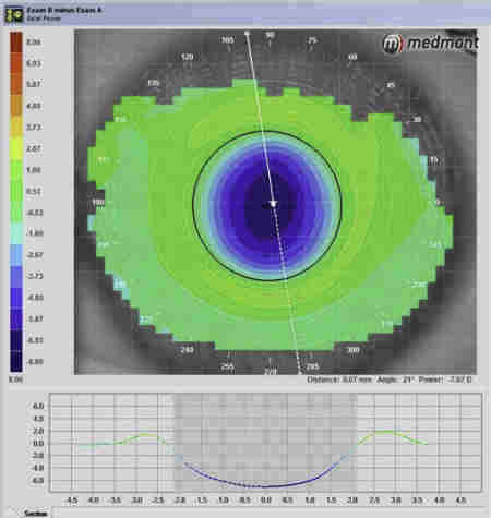 Fig 6. In contrast to Fig 5, the over-topography of the Artmost SoftOK lens clearly shows a steepening periphery not unlike that of a high myopia ortho-k result. Photo courtesy of Paul Levine