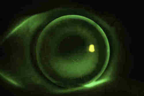 Fig 7. The 10.5mm bitoric rigid corneal lens with myopia control optics fitted to my 10-year-old patient