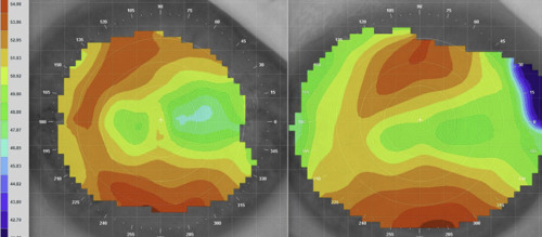 Fig 3. The advantage of composite topography maps with the E300 topographer. The composite map (right) shows a wider area that just the graft curvature seen on the single map (left)