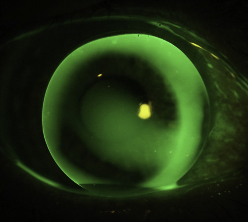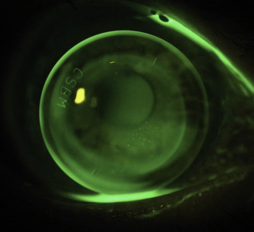 Fig 2. This RGP lens needs a reverse geometry design to align the relatively flat graft curvature, courtesy of Paul Rose.