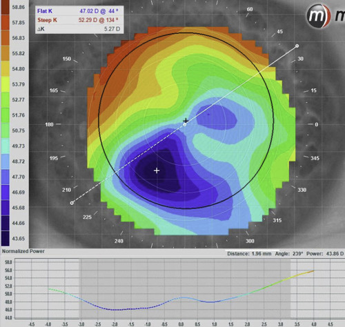 Figure 5: The irregular corneal topography of my patient’s right eye.