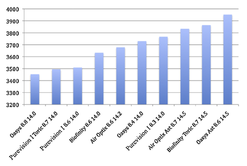 One of the problems I see is, as practitioners, we are not told any information about the sagittal height of commonly available soft lenses. So even if we can measure our patient’s corneal data, we cannot apply it in a scientific way. A recent study attempted to shed some light on this by measuring the contact lens sagittal height of common fortnightly and monthly replacement silicone hydrogels (Fig 2.).