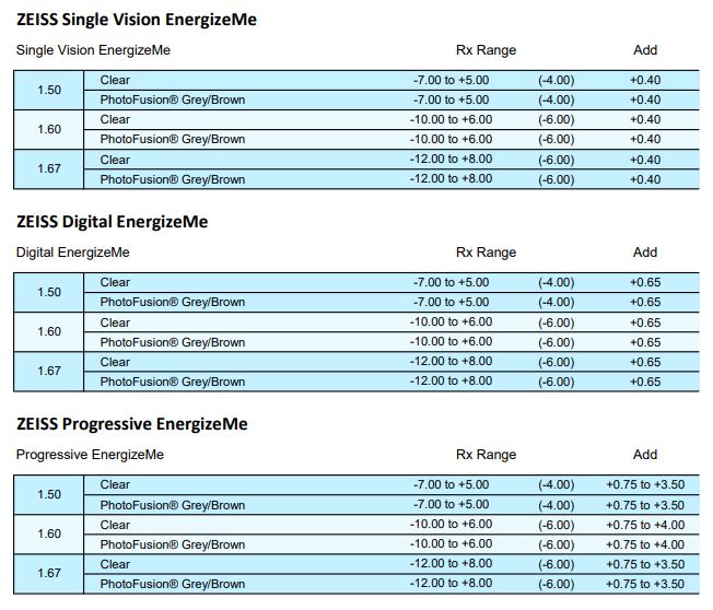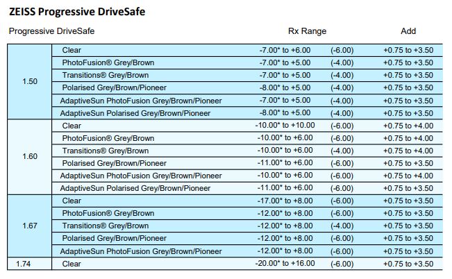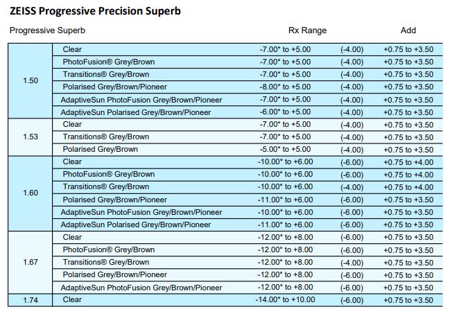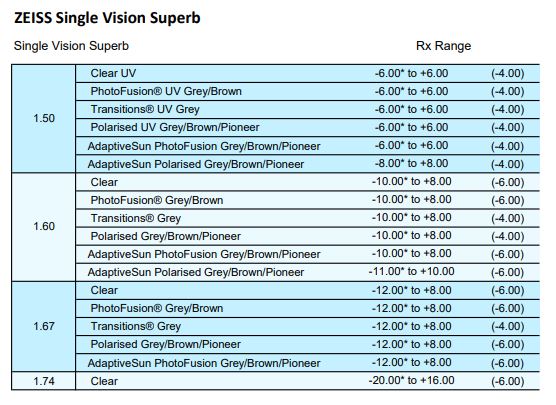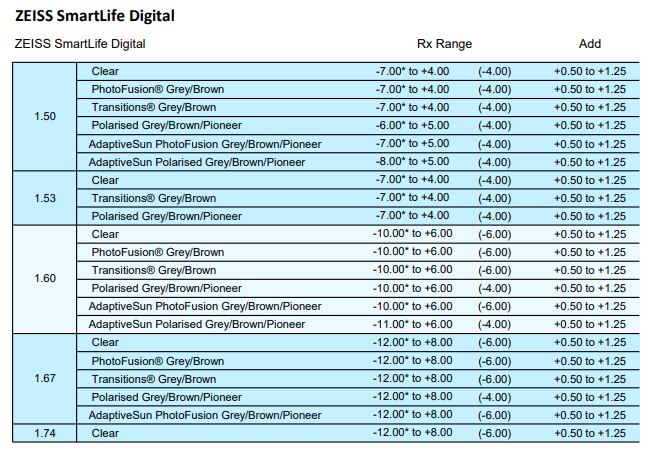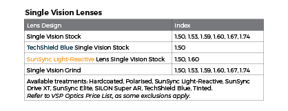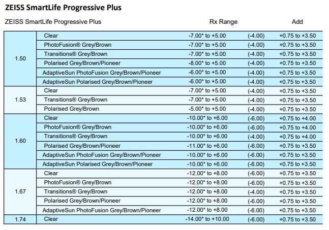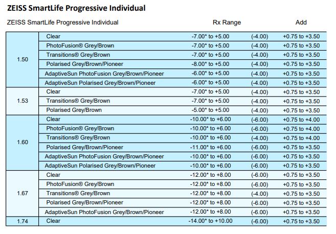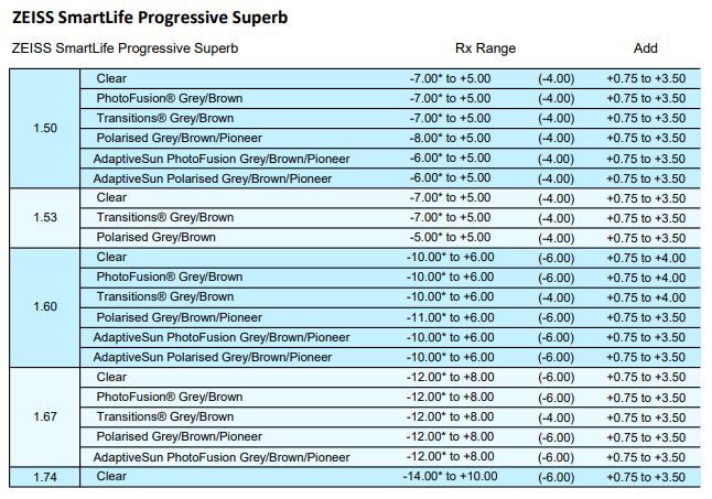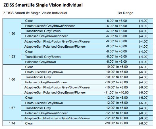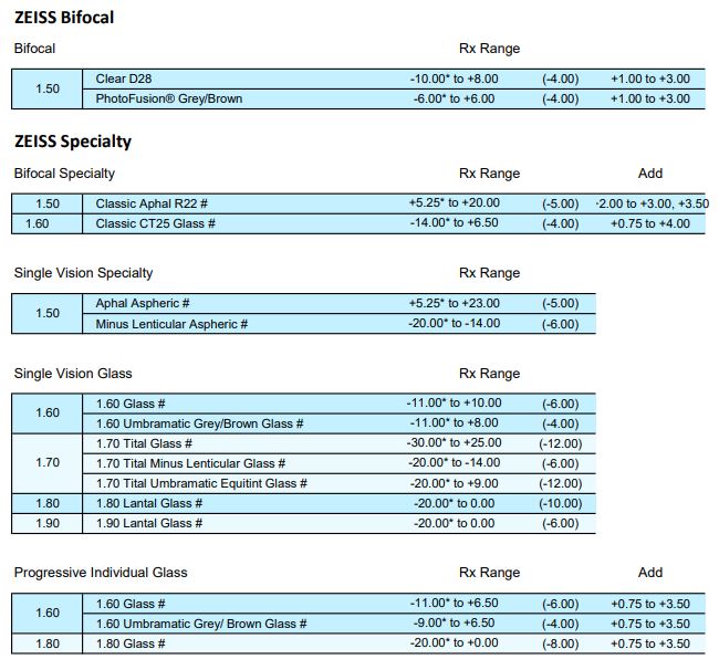 • SFSV 1.50, 1.53 Trilogy Spherical, 1.53 Trilogy Aspherical, 1.59 Poly, 1.60, 1.60 Spherical HMC & HC, 1.60 Aspherical HMC, 1.67, 1.67 Aspherical HMC, 1.74