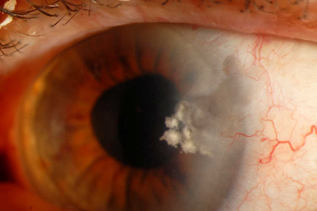 Fig 2. Apparent early control of keratitis after three months of treatment. Note the quiescent eye but suspicious white deposits in stroma. Ciprofloxacin was stopped at this stage