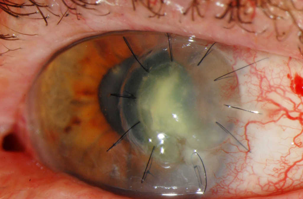 Fig 4a. Progessive infection with development of interface fluid affecting the temporal, lamellar tectonic corneal graft with loosening of sutures (6 weeks post-op)