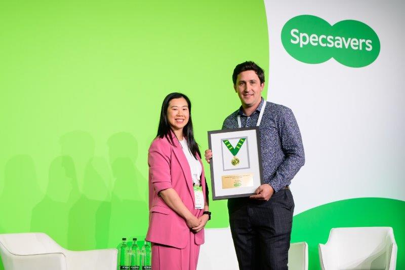 Specsavers’ Cindy Nguyen with Lachlan Martin, Specsavers Hornby (accepting on behalf of Alice Jackson)