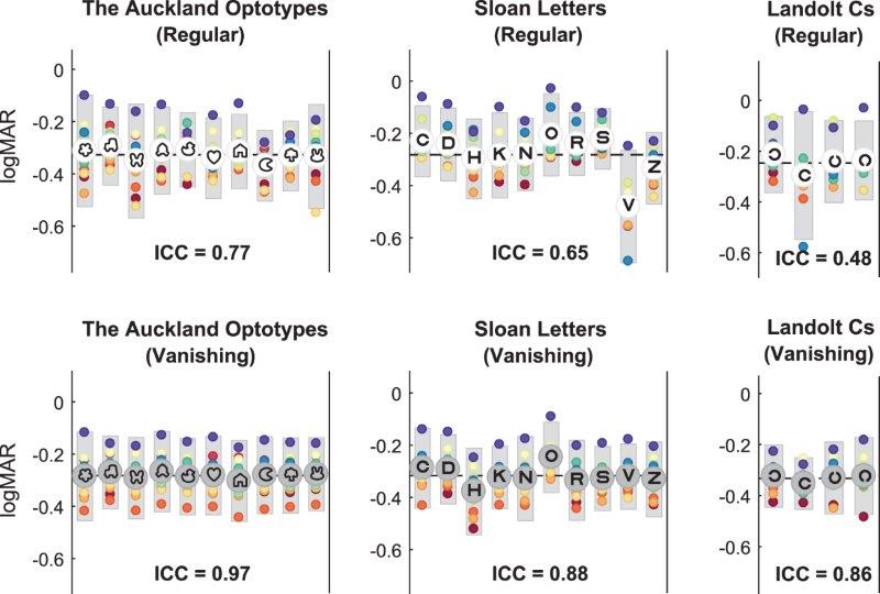The intraclass correlation (ICC) value denotes the proportion of variance attributable to differences between subjects. Higher ICC values demonstrate more consistent acuity estimates between optotypes