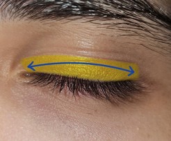 Fig 1. Periocular regions where castor oil was applied is shaded in yellow. Blue arrows show the direction of rollerball movement