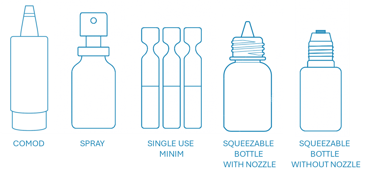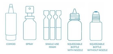 Fig 1. Schematic representation of the various eye drop bottle designs tested in the study. These included COMOD, spray, single-use minims, traditional squeezable bottle with nozzle and squeezable bottle without nozzle