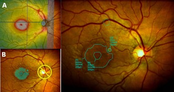 Fig 1A. An OCT thickness map is imported to the Navilas system and automatically registered and overlaid onto to a live fundus image. B. Treatment planning is done on a touch screen and laser treatment is delivered using real-time eye-tracking. Areas of the fundus, in this case the optic nerve, can be marked as no-go areas for the laser. A titration spot at the arcade is used to calculate an appropriate subthreshold power setting. C (large to the right). At the end of laser treatment, an image is captured and a summary documenting areas of threshold (laser uptake visible) and subthreshold (no visible uptake) areas of treatment is produced