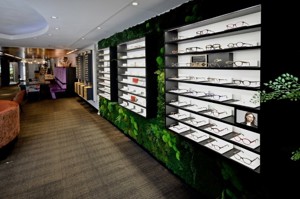 Each frame has its own mini stage with a small block of colour in-between to separate each brand in this spacious practice