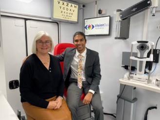 Barbara Blake with optometrist, teacher and driver Veeran Morar inside the kitted-out Vision Bus