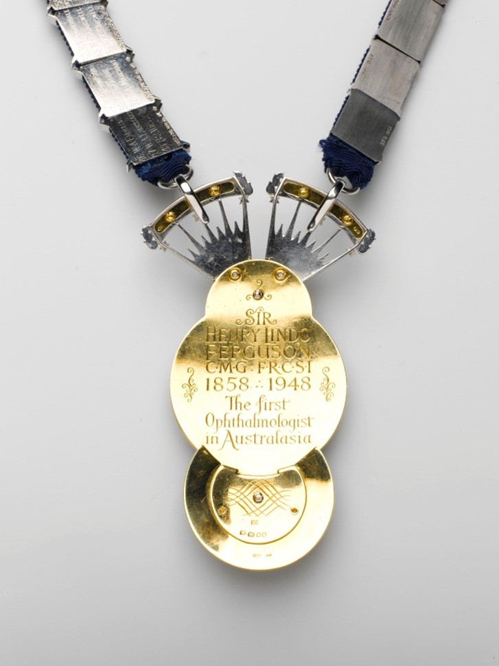 Come 1970, at the 24th OSNZ conference in Christchurch, a handsome presidential society medallion, generously commissioned by the Ferguson family and designed by Cecil Thomas of London, was presented to the then president Dr Harry Wales in memory of Sir Lindo Ferguson, from his grandson Dr RH Lindo Ferguson and other family members. On its reverse is engraved ‘Sir Henry Lindo Ferguson, CMG, FRCSI, 1858-1948. The first ophthalmologist in Australasia’. Although Sir Lindo’s eminence and contributions are undisputed, he was not the first ophthalmologist in Australasia, despite being the first fully trained ophthalmologist in New Zealand. When OSNZ amalgamated with RACO in 1997 to become The Royal Australian and New Zealand College of Ophthalmologists (RANZCO), the medallion was modified and continues to be worn by the chairperson of the RANZCO New Zealand Branch to this day.