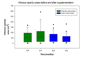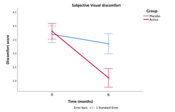 The first non-surgical, non-invasive treatment for eye floaters, Vitrocap N contains five nutrients: L-lysine amino acid, ascorbic acid (vit C), hesperidin (derived from citrus fruit extract), proanthocyanidins (derived from grapeseed extract) and zinc, and has been studied in five clinical trials. The most recent, the Flies study (Ankamah et al, 2021), was a double-blind, placebo-controlled trial involving 61 patients (aged 18-79 years, with a mean age of 57.4 years) suffering from vitreous floaters. Evaluated by questionnaire and clinical measures, the study found significant improvements in visual comfort, opacity and contrast sensitivity after patients took one capsule a day for six months (see graphs below). “Notably, a large percentage of patients (77%) on the active supplement demonstrated a reduction in vitreous floaters and associated improvements in vision-related quality of life was seen in 67% of patients,” reported principal investigator Professor John Nolan, founder and director of the Nutrition Research Centre Ireland. Lead researcher Dr Emmanuel Ankamah said the study provides evidence supporting the use of a targeted nutritional intervention as a management strategy for vitreous floaters. “This gives us more confidence that using antioxidative and antiglycation micronutrients can improve vitreous health.”