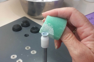 The process of tinting custom soft lenses. The vials on the back ledge are comparison lenses for matching particularly challenging patients