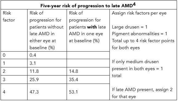 While the clinician keeps busy determining best injection treatment plans for our wet AMD patients – as well as the need for injection-only clinics to relieve health service demand – doctor-patient consultations can become fewer in between. When we do have the opportunity to see our patients, one must not forget the multilateral approaches we have to improve their ocular health. From an AMD perspective, it can be easy to focus on the treatment response of the fluctuating subretinal fluid above the CNVM of one eye and be glad the other eye ‘still only’ has dry AMD with some large drusen and pigment change. In such a scenario, it may be worthwhile to recall that established risk calculation tables3 are available that would give this patient the highest risk factor score of 4 and a five-year risk of progression to late AMD of around 53%.