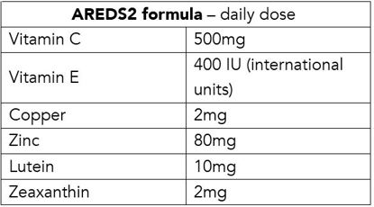 It appears that AREDS2 supplementation will cost patients around $100 for three months, which for some represents a significant financial burden. Where possible, encouragement of a varied diet with a range of coloured fruits and vegetables and regular fish intake is also likely to reduce the risk of development or progression of age-related macular degeneration.