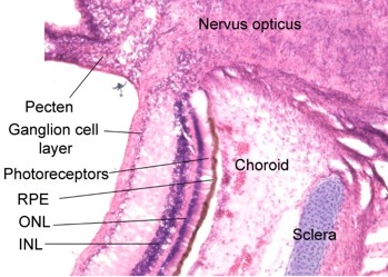 Rather than an intrinsic retinal vasculature as in humans, in birds’ eyes inner retinal nutrition is provided by the pecten, a vascular extension into the vitreous of the central retinal artery, and a thicker choroid.