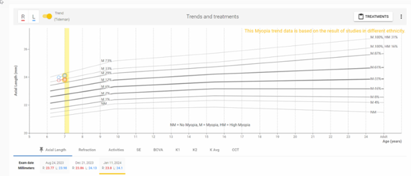 In December 2023, the patient was examined in our clinic and axial lengths of R 23.86mm and L 24.13mm were recorded. When plotted on a Tideman trend graph, taking into account the patient was a seven-year-old Caucasian female, these measurements indicated we could expect to see a significant increase in axial length in the next two years with an increased risk of high myopia in adulthood (Fig 9). We prescribed RLRL therapy, which the patient began the next day.