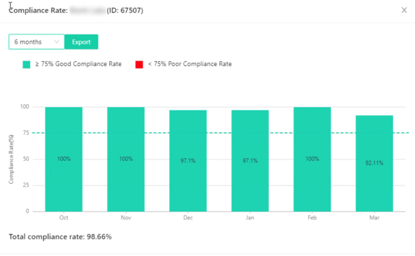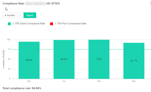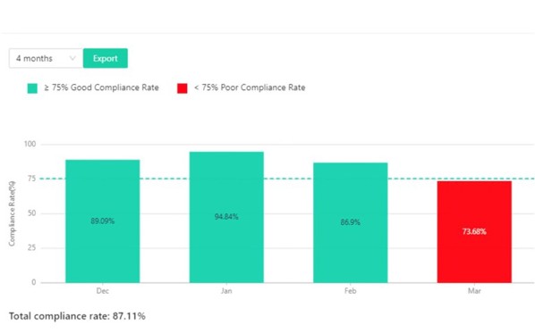 Compliance is typically calculated as the percentage of recommended treatment time that a patient actually uses the device. Patients need to use the device twice a day, for five days in every rolling seven days. Therefore, within each seven-day period the patient should receive 10 treatments. For example, patient three started her treatment on 11 January. Her treatment records for the following three weeks show how often she used the device: 11/01-17/01: 10 times; 18/01-24/01: eight times; 24/01-31/01: six times. So patient three’s January compliance rate is calculated as: 24 uses / (21/7 x 10) x 100 = 80%.