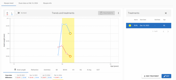 By November 2023 axial length was R 26.16mm, L 26.26mm. At this point we suggested to the patient and his parents that we stop atropine and add RLRL therapy to his treatment regimen. They agreed and in December 2023, the patient returned to collect the Eyerising device. He was briefed on its use and his axial length was recorded as R 26.15mm, L 26.27mm, which became the baseline to assess the treatment’s effectiveness.