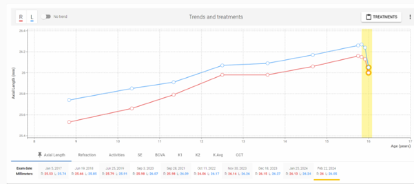By October of 2022, axial lengthening was measured at R 26.06mm, L 26.17mm and we increased the atropine to 0.02%. We continued to see axial lengthening over the next year, despite gradually increasing the strength of the atropine solution to 0.1%.