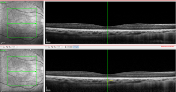 Figs 10 and 11. Patient three’s choroidal thickness pre-treatment (top) and at one-month follow-up