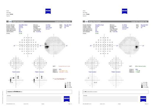 Automated visual field testing was normal for the right eye and the left showed patchy nonspecific changes temporally and in the superior field (Fig 2). Macular OCT scans were normal. The OCT retinal nerve fibre layer thickness scans demonstrated the glial tissue remnant at the right optic nerve head and optic nerve head swelling in the left eye (Fig 3).