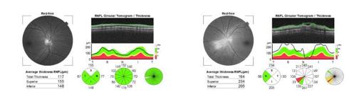 Fig 3. The OCT retinal nerve fibre layer thickness scan of the right eye is normal. The OCT scan of the left eye demonstrates optic nerve head swelling