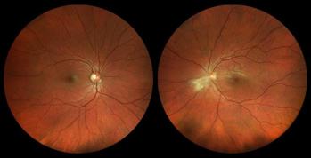 Fig 1. Widefield colour fundus photograph of the right eye shows a glial tissue remnant on the nasal aspect of the optic nerve head. Fundus photograph of the left eye shows inflammation adjacent to the nasal margin of the optic nerve head