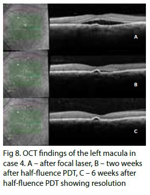 A gentle treatment with argon laser was performed (100mW, 10ms and 100µm). Six weeks after the laser therapy (Fig 3D), the condition has completely resolved, with a visual acuity of 6/9 in the right eye.