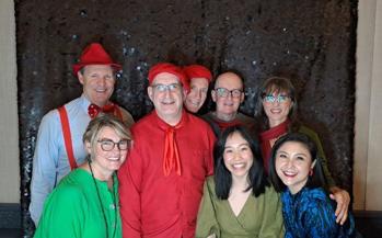 Red/green, red/blue dinner guests (back L-R) Author Evan Brown, Brenton Clark, Keith Miller, Niall McCormack, Sally Adams and (front L-R) Kristine Jensen, Jackie Low and Mimi Wong
