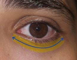 Fig 1. Periocular regions where castor oil was applied is shaded in yellow. Blue arrows show the direction of rollerball movement