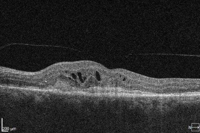 Fig 1. Subretinal fibrosis following delayed presentation of nAMD
