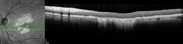 Fig 2. A 72-year-old male’s atrophic AMD. Infrared and OCT images indicating cRORA.
