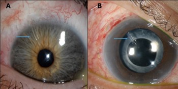 Fig 3. The Preserflo MicroShunt (A) in comparison to a traditional tube-shunt (Paul tube in the sulcus) (B)