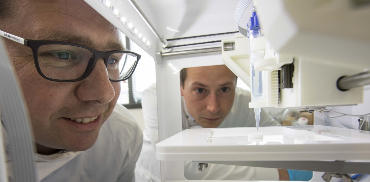 Professor Che Connon (left) and Dr Steve Swioklo 3D-print a 'cornea'