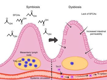Fig 3. Short-chain fatty acids from the gut microbiota support the intestinal barrier, enhance Treg cells, and limit Th17 cell migration. Credit: Samalia et al1
