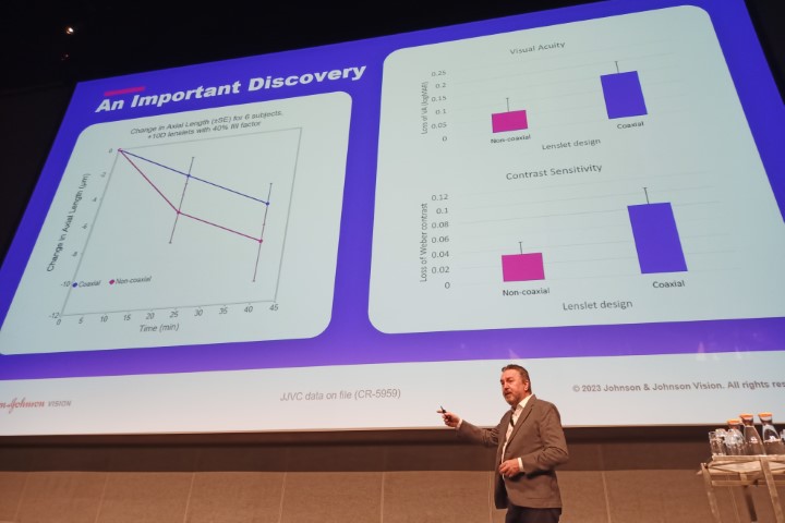 Speaking to a packed auditorium at O=Mega23/WCO4 in Melbourne, Noel Brennan unveiled Johnson and Johnson Vision’s (J&Js) latest, self-proclaimed “breakthrough soft contact lens for myopia control”.