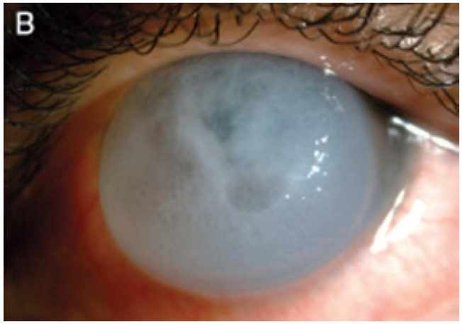 Fig 2 B. Severe acute corneal hydrops in keratoconus in a 16-year-old subject who had initially presented with keratoconus only six months earlier
