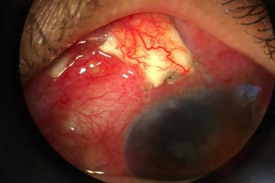 A week later, we breathed a sigh of relief to see the hyphaema had resolved and the IOP had dropped to 36mmHg… but we were totally unaware of what was coming! She walked back into the clinic with a red sore eye three days later and this time the conjunctiva overlying the plate of the Baerveldt implant had eroded, exposing the implant plate (Fig 2). The implant had to be removed urgently and we were able to offer nothing further at that stage. Hence, the fibrosed conjunctiva was sutured back in the best possible way to prevent any aqueous leak.
