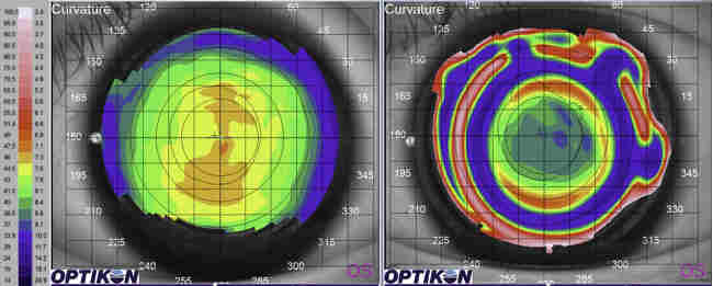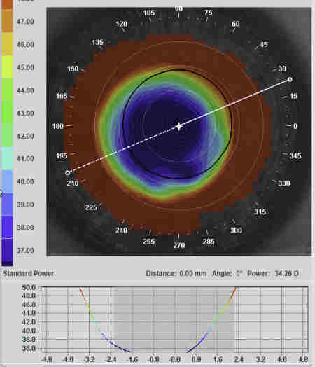 Fig 6. In contrast to Fig 5, the over-topography of the Artmost SoftOK lens clearly shows a steepening periphery not unlike that of a high myopia ortho-k result. Photo courtesy of Paul Levine