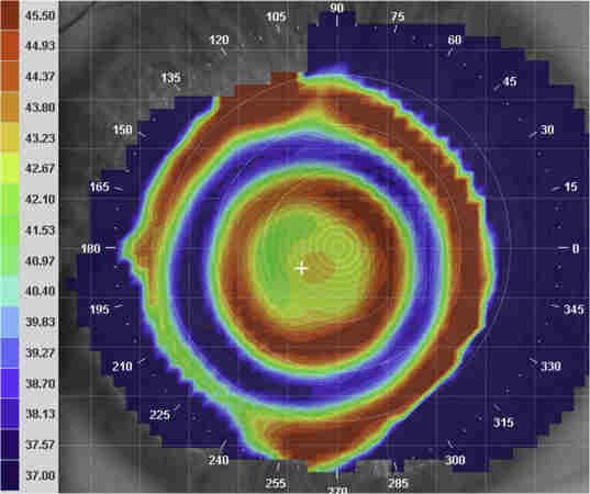Fig 5. Over-topography of NaturalVue. Note the difficulties the topographer has showing the rapid increase in peripheral plus. Photo courtesy of David Sweeney, supplied by Sally Dillehay, CMO of Visioneering Technologies