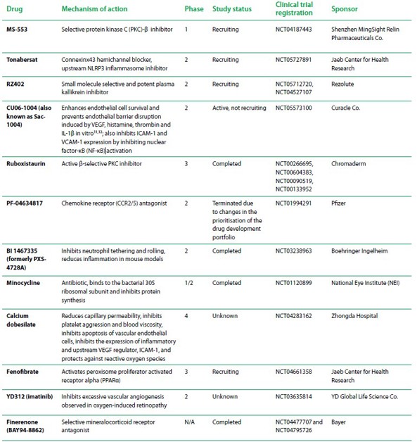 Intravitreal anti-vascular endothelial growth factor (anti-VEGF) injections, laser panretinal photocoagulation and intravitreal corticosteroid implants are clinically used to resolve diabetic macular oedema (DMO), the most common cause of vision loss in diabetic retinopathy (DR) patients. However, these are only indicated for patients who have developed sight-threatening DR. They are not used prophylactically, do not reduce the risk of disease progression and may need to be repeatedly administered if oedema recurs. In the hope of discovering novel therapeutics to halt DR progression, several clinical trials are now underway. Metformin and fenofibrate, which are well-known diabetes medications, have shown encouraging clinical results in slowing DR progression.