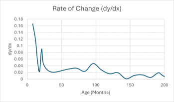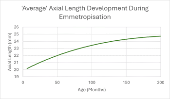 While graphs showing axial length growth often show smooth curves (Fig 1), it is also worth examining the rate of change, as shown in Fig 2. This helps us understand the periods in development where the greatest rates of change, and therefore growth, are occurring. They can also be useful for showing when a patient is experiencing a growth acceleration that does not conform to expected patterns. Axial length, however, is a lag indicator rather than a predictive measure, making research into the factors driving emmetropisation an important endeavour to facilitate interventions.