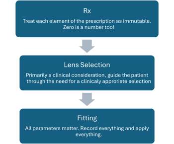 1. Rx – treat each element of the prescription as immutable. Even the absence of a value (such as no cylinder or prism) should be treated as that value equalling zero